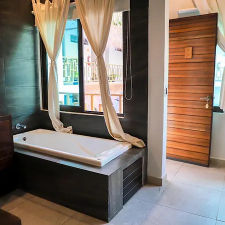 Hotel Diosa Del Agua Bacalar的客房不仅配备了保险柜,迷你冰箱 和卫星频道平板电视,还配有浴缸,分开的洗手间 和淋浴. 某些客房还能欣赏水池的景致.